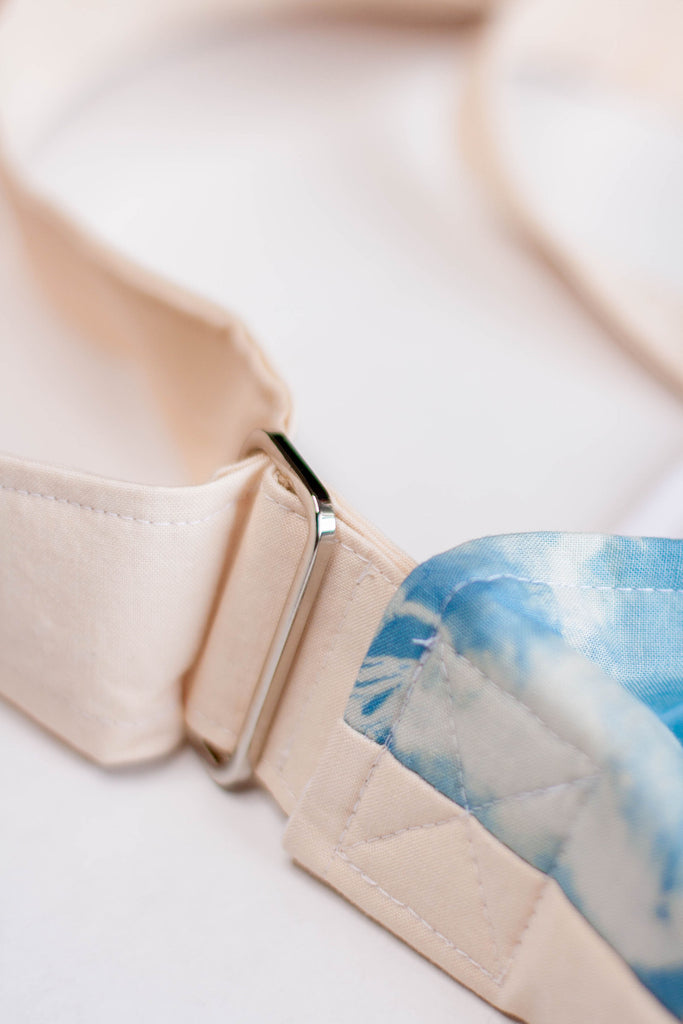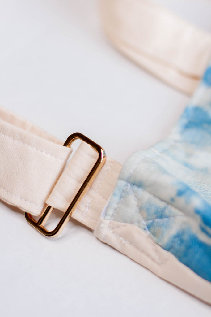 This bag wants to go everywhere with you and it's equipped to do so! It is versatile as it features a 2-inch adjustable strap and two handles for various carrying options. The patchworked design features an off-white color and a tie-dyed sky-inspired blue. The adjustable strap is available in gold or silver hardware. The bag is lined with a satin lining to protect the outside design.
